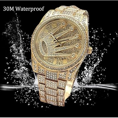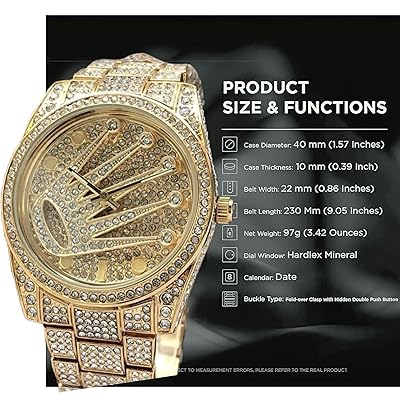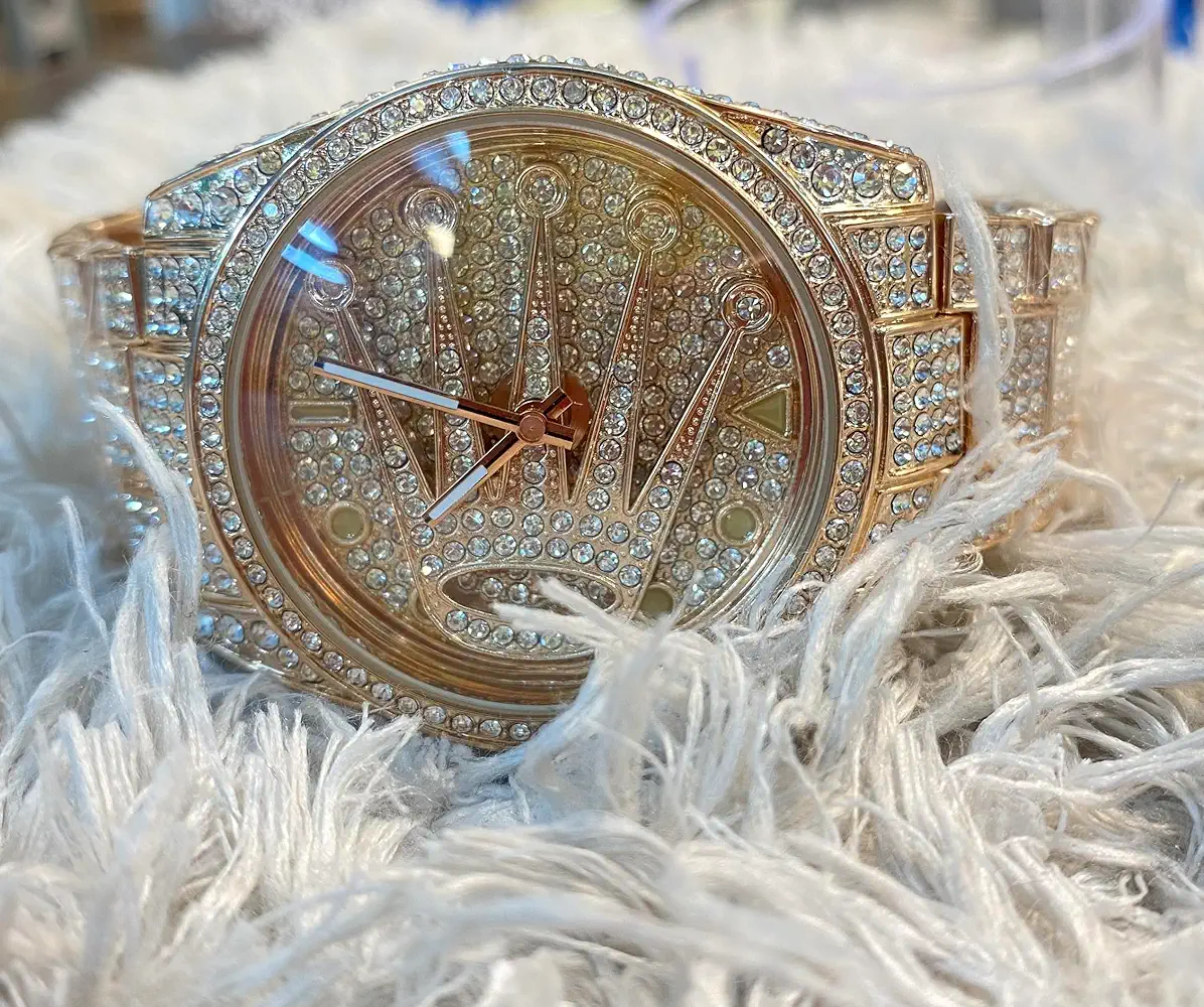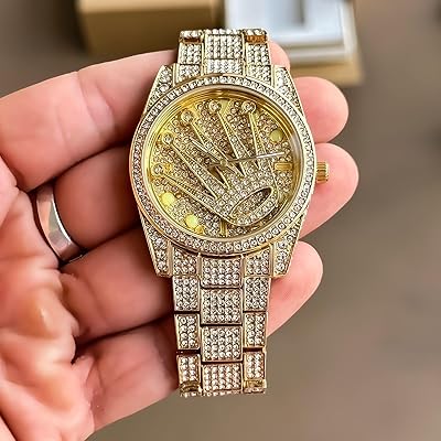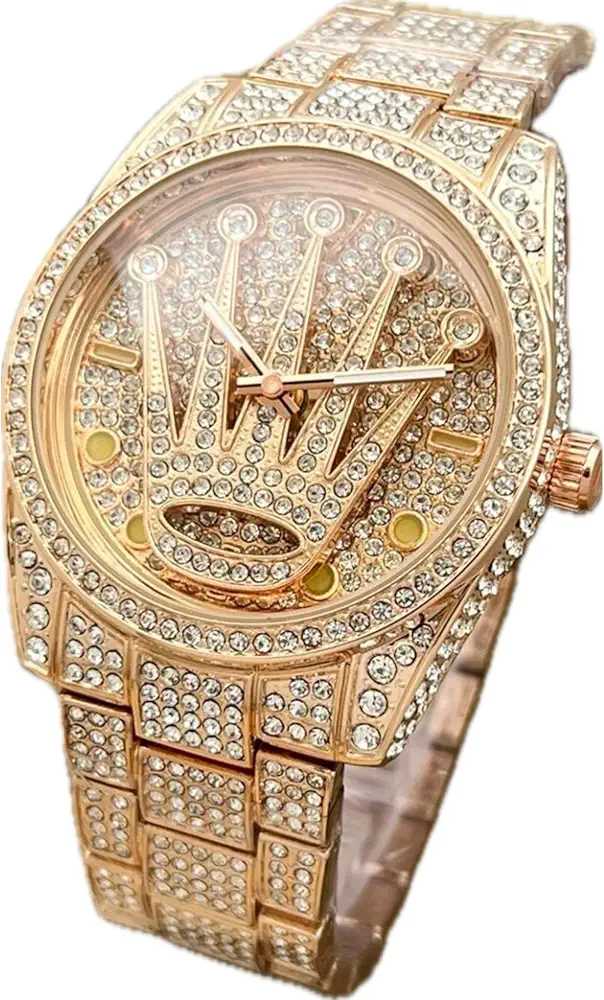 Turn heads with this luxury iced-out Rolex-inspired wrist watch. Featuring a full gold-tone body covered in dazzling rhinestones, this timepiece adds instant glam to any outfit. With its bold design and premium look, it’s perfect for special occasions or everyday bling.