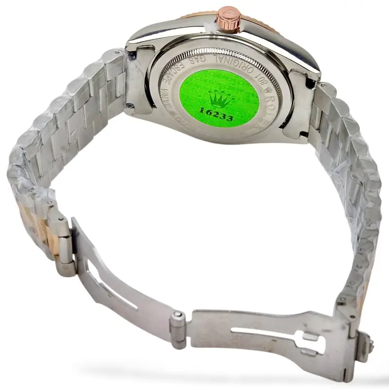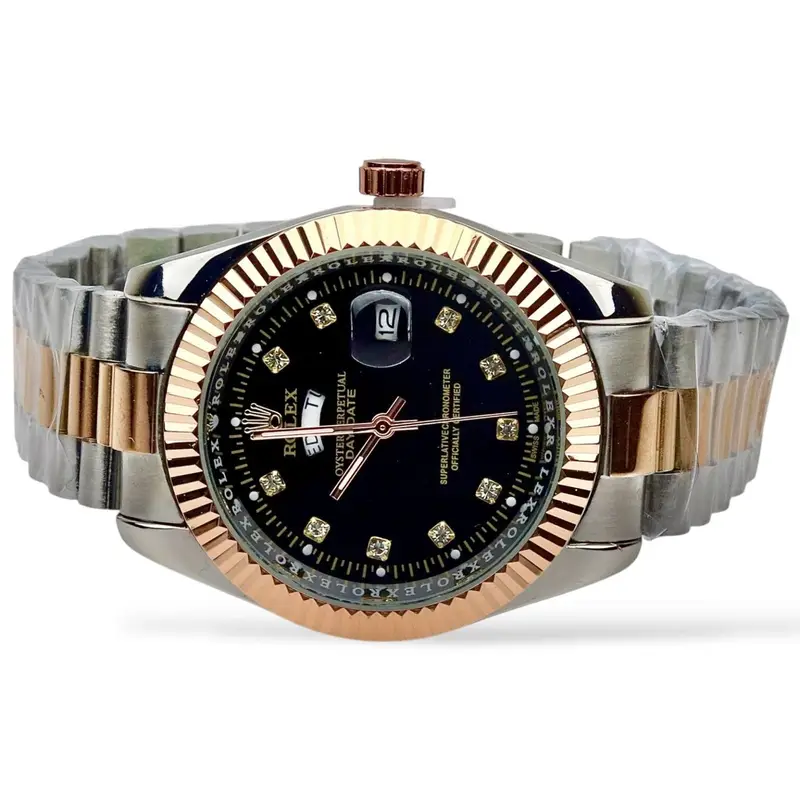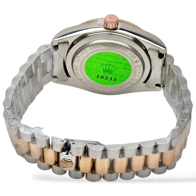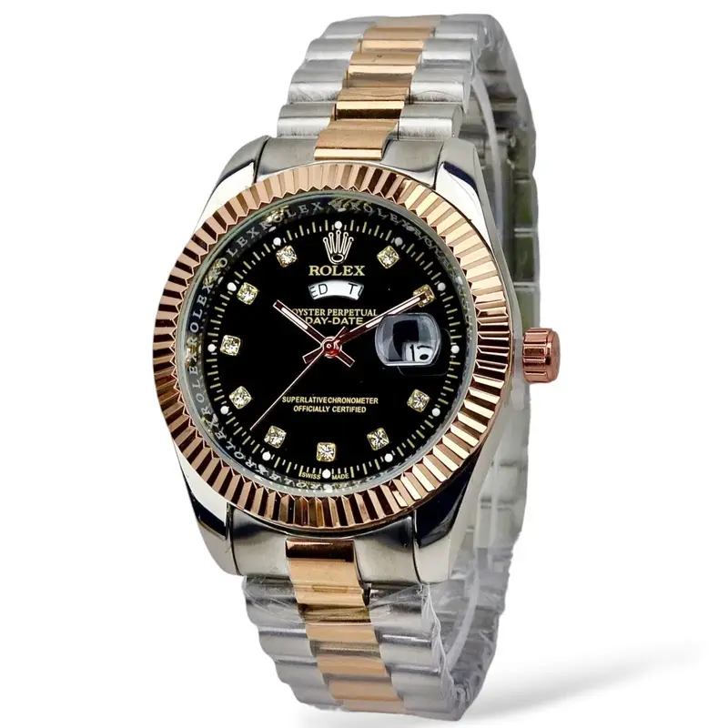 Discover the epitome of prestige with the RLX Royal Day-Date — a watch crafted for those who command excellence. With a gleaming two-tone blend of rosegold and stainless steel, and a dial illuminated by diamond-style markers, this timepiece is designed to leave a lasting impression.