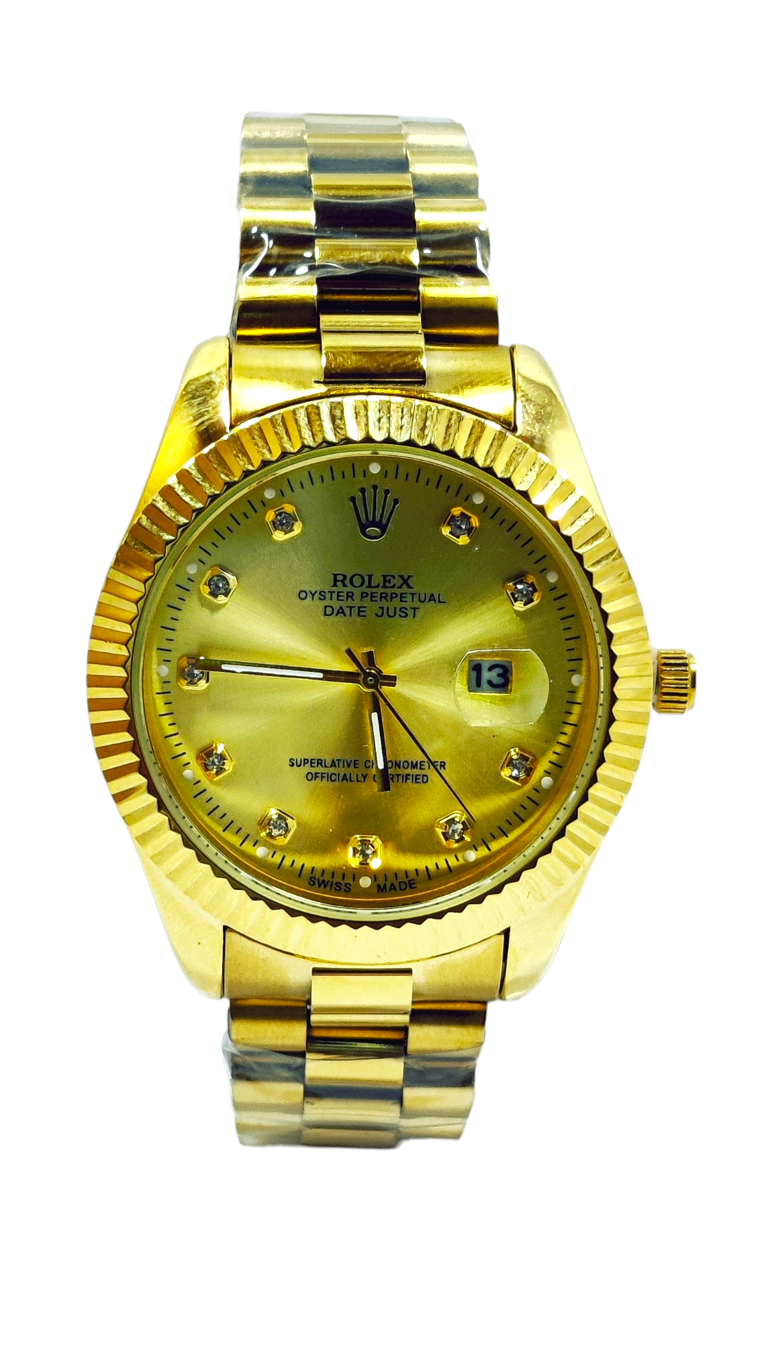 Make a powerful statement with the Imperial Gold DateTime Watch – Luxe Edition. Featuring a radiant gold-tone finish, sparkling crystal hour markers, and a bold fluted bezel, this timepiece blends classic sophistication with modern flair. The clear date display adds functionality, while the Oyster-style link bracelet ensures a comfortable, secure fit. Perfect for formal occasions or elevating your everyday style – it’s not just a watch, it’s a statement.